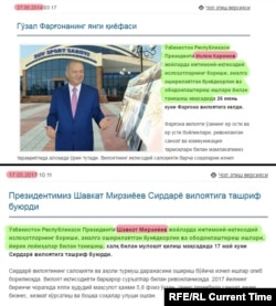 Между текстами выше – почти три года разницы. Первая статья – о визите Ислама Каримова в Ферганскую область и о "последовательном развитии экономики" региона. Во второй описывается приезд Шавката Мирзиёева в Сырдарью и о "стабильных шагах развития экономики" в этой области.