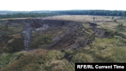 Воронка на месте провала в Львовской области больше напоминает кратер вулкана. Ее площадь – шесть га, почти 9 футбольных полей. Глубина – полсотни метров. Упавшие в провал опоры линии электропередач сверху выглядят как спички.